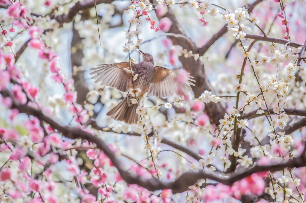 冬に咲く椿の花が終わりを告げ、梅が咲きだす一時期に城南宮では有名な情景です。
